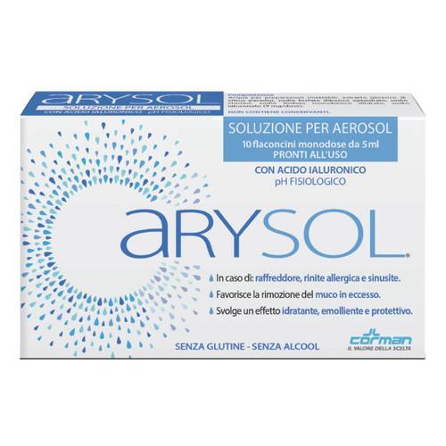 Soluzione sterile isotonica a pH fisiologico per aerosolterapia. Arysol nebulizzato con apparecchio aerosol, favorisce l'idratazione e la fluidificazione del muco in eccesso, facilitandone la rimozione e consentendo l'attenuazione dei sintomi legati alla congestione nasale ed agli strati irritativi generalmente associati. Senza alcool.
