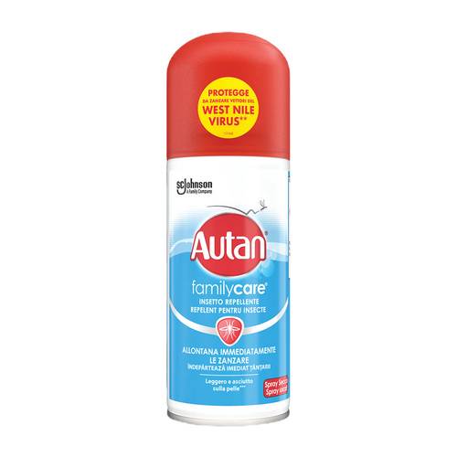 Autan Family Care Spray Secco protegge dalle zanzare fino a 4 ore per applicazione.