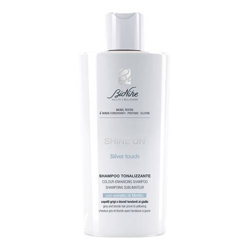 BIONIKE SHINE ON SILVER TOUCHDescrizione Shampoo tonalizzante che dona una luminosa tonalità argentea ai capelli grigi, bianchi, decolorati e/o con meches, neutralizzando la tendenza ad ingiallire. Arricchito con aminoacidi ed estratto di mirtillo, deterge delicatamente i capelli che ritrovano s... Leggi tutto...