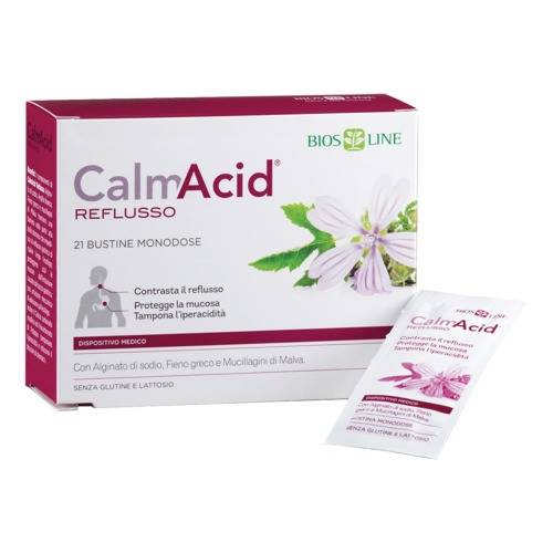 Indicazioni: CalmAcid Reflusso contiene Alginato di sodio, Argilla bianca, Fieno greco (estratto ricco in galattomannani) e mucillagini di Malva; è formulato per contrastare il reflusso, proteggere le mucose gastro-esofagee e tamponare l'iperacidità di stomaco riducendone i sintomi correlati come sensazione di rigurgito, esofagite, pirosi, tosse, flogosi rinofaringea, disturbi dovuti al reflusso gastro-esofageo. Dolcificato con Stevia.