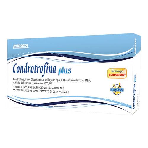 Condrotrofina plusDescrizione Integratore alimentare a base di Condroitinsolfato, Glucosamina, Sodio glucoronato, Metilsulfonilmetano (MSM), Collagene di tipo II, Artiglio del Diavolo, Vitamina B1 (Tiamina) e Vitamina D3. L'Artiglio del diavolo aiuta a favorire la funzionalità articolare. La Vit... Leggi tutto...