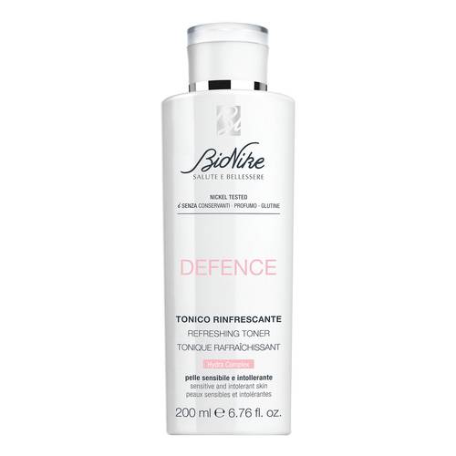 BioNike DEFENCE LOZIONE TONICA RINFRESCANTE Soluzione tonificante priva di alcool, ideale per completare la pulizia della pelle sensibile ed intollerante del viso e per donare un’immediata sensazione di freschezza. A pH leggermente acido, svolge una delicata azione astringente, rispettando la fisiologia della cute. Con aloe vera, acqua distillata di amamelide, acqua distillata di rosa, complesso idratante (sorbitolo + sodio PCA + sodio lattato). Prodotto altamente tollerabile, senza glutine, profumo e conservanti; testato per il nichel.
