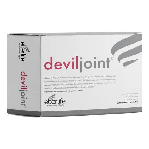 DeviljointDescrizione Integratore alimentare a base di MSM, condoritin solfato, glucosamina, calcio, magnesio, ASU-greasine, vitamina C, artiglio del diavolo, manganese, zinco, acido ialuronico, vitamina D. Il calcio è necessario per il mantenimento di ossa normali. Il magnesio, il mangane... Leggi tutto...