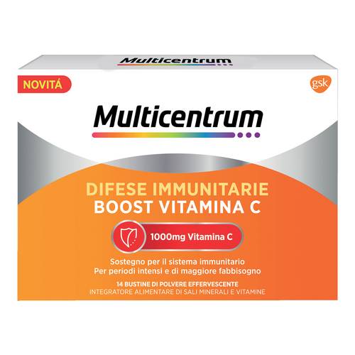 Multicentrum DIFESE IMMUNITARIE BOOST VITAMINA CDescrizione Integratore alimentare di Sali minerali e vitamine con 100 mg di vitamina C per affrontare la stagione invernale. Vitamina C, D, B6, B12, acido folico e zinco contribuiscono alla normale funzione del sistema immunitario. Vitami... Leggi tutto...