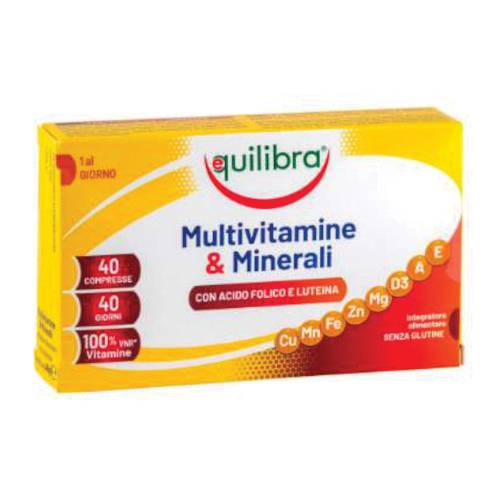 equilibra Multivitamine & Minerali Integratore alimentare a base di Vitamine e Minerali con Luteina, indicato nei casi di ridotto apporto con la dieta o di aumentato fabbisogno di tali nutrienti. Senza glutine.