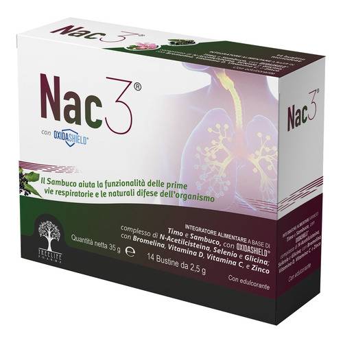 Nac 3Descrizione Integratore alimentare a base di pelargonio e sambuco, con bromelina, N-acetilcisteina, vitamina C, vitamina D, selenio e zinco. I principi attivi contenuti nell'estratto vegetale di sambuco favoriscono la fluidità delle secrezioni bronchiali, la funzionalità delle prime vie res... Leggi tutto...