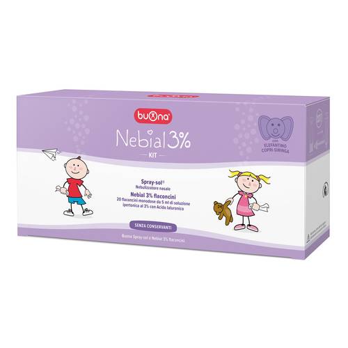 La soluzione salina ipertonica al 3%, con aggiunta di acido ialuronico, contenuta nei flaconcini di Nebial 3% KIT, svolge un'azione decongestionante sulle mucose nasali e possiede un effetto fluidificante sul muco.