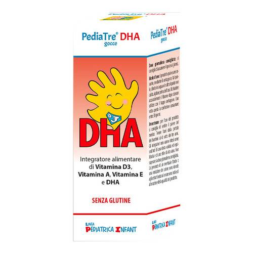 PediaTre DHA gocceDescrizione Integratore alimentare di Vitamina D3, Vitamina A, Vitamina E e DHA. La Vitamina D contribuisce al normale assorbimento del calcio e del fosforo ed aiuta a mantenere le ossa e i denti sani. Contribuisce inoltre alla normale funzione del sistema immunitario. Ingre... Leggi tutto...