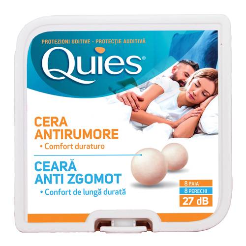 Quies PROTEZIONI UDITIVE Dispositivo medico CE. Tappi auricolari in cera naturale e cotone. Sicuri e anallergici, si modellano facilmente con le dita e si adattano perfettamente al canale auricolare. Riducono il rumore di 27 decibel.
