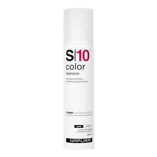 S10 Color è uno shampoo protettivo antietà dalla formula innovativa specifico per ristabilire le qualità alterate dei capelli trattati. A base di tensioattivi naturali ultradelicati SLS free, S10 Color deterge con dolcezza e protegge il colore, donando morbidezza e luminosità alla fibra. Grazie alle proprietà antiossidanti degli estratti di ribes rosso e a quelle rivitalizzanti delle proteine della seta, i capelli appaiono da subito più brillanti e morbidi con la cuticola liscia e ben protetta.