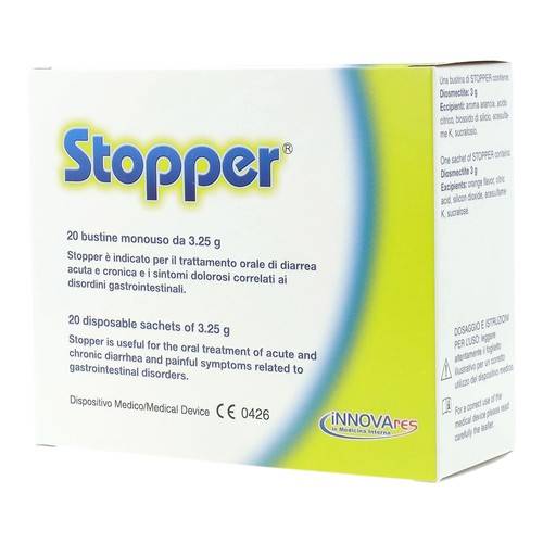 Dispositivo medico CE 0426 (Dir. 93/42/CEE), classe IIa. Stopper è efficacemente impiegato in caso di accelerato transito intestinale (diarrea acuta e cronica), in presenza di ileostomia o di ileoanoanastomosi o negli esiti della chirurgia dell’apparato digerente, compresa la chirurgia dell’obesità, in caso di alvo diarroico da intestino irritabile, in caso di “diarrea del viaggiatore” o per migliorare la continenza fecale in presenza di alvo fluido. Gusto limone.