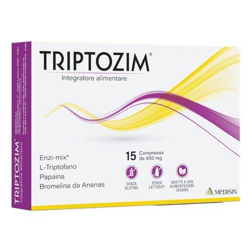 TRIPTOZIM Integratore alimentare. Ingredienti L-Triptofano; pool enzimatico: papaina, bromelina, lactasi, amilasi, lipasi, cellulasi, aminoglucosidasi, pectinasi, proteasi. Modalità d'uso 1 compressa prima o durante i pasti. Avvertenze Per donne in gravidanza o in allattamento e bambini ... Leggi tutto...