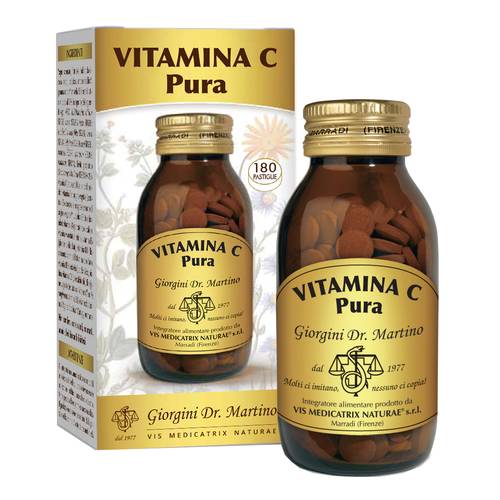 VITAMINA C  Pura Integratore alimentare a base di piante. Rosa canina, acerola e camu-camu sono frutti naturalmente ricchi di vitamina C, la quale possiede molteplici proprietà: favorisce il metabolismo energetico riducendo la stanchezza e l’affaticamento; protegge le cellule dallo stress ossidativo e rigenera la forma ridotta della vitamina E; contribuisce alla normale funzione del sistema immunitario, del sistema nervoso e psicologica; promuove la formazione del collagene aiutando a mantenere le normali funzioni di vasi sanguigni, ossa, cartilagini, pelle, denti e gengive; incrementa l’assorbimento del ferro.